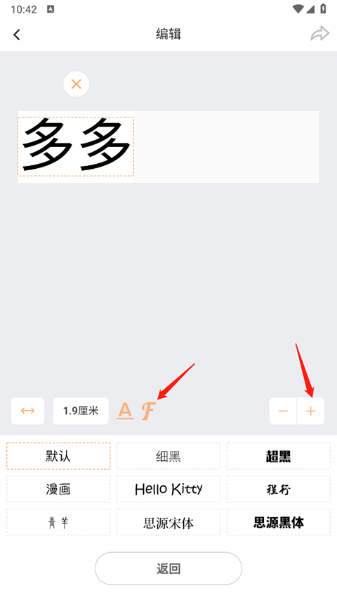 点击确定后内容就会出现在上方,这时你可以点击右下角+号来切换字体的大小,如果想切换字体样式可以点击F按钮