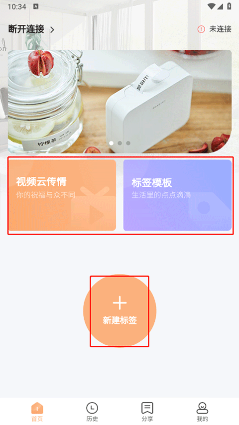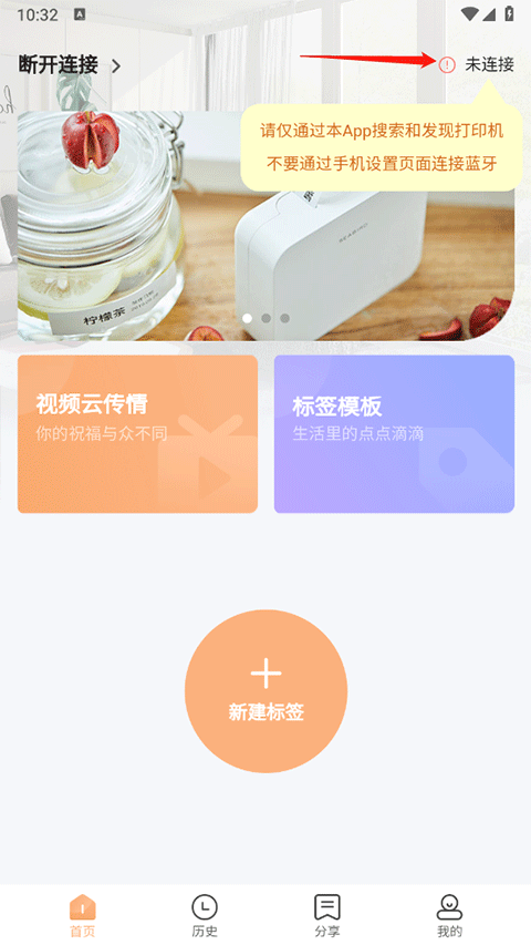 打开海鸟贴纸打印机app后点击右上角的未连接