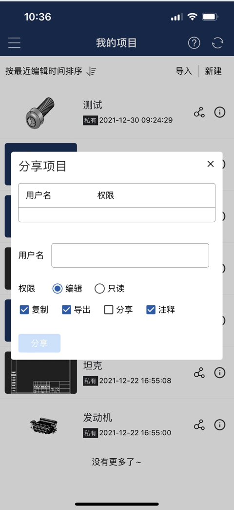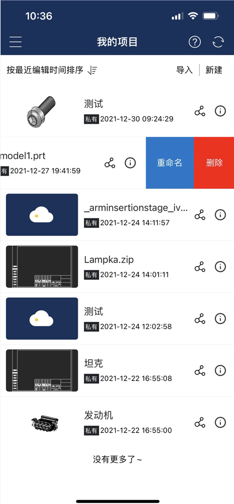 导入: 点击“导入”,显示当日可用的导入次数,在手机文件中选择支持的模型格式,选择后开始进行导入。支持的模型格式为:IGES、STEP、PTC、NX、CATIA、SolidWorks、ParaSolid、OBJ、STL、IFC、3DM、Revit、PDF、DWG。 (说明:在项目管理界面导入的文档自动创建一个项目,项目中显示导入的文档。)