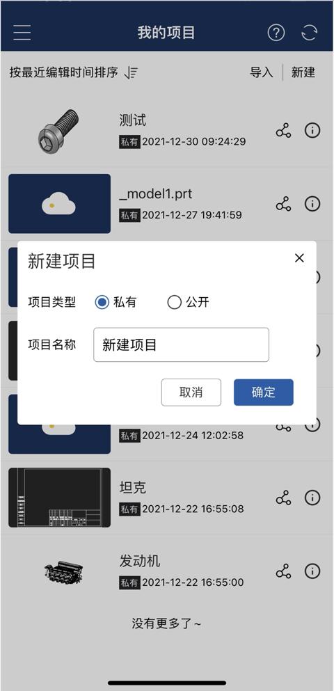 新建: 点击“新建”,在手机底部弹出新建菜单,可以选择新建项目或文件夹。 选择新建项目时,可选择项目类型为私有或公开。新建项目时默认自动创建一个空的零件与装配文档。