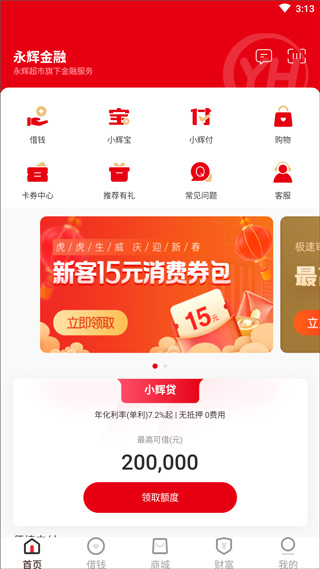 1、打开永辉金融app,在首页可以看到很多永辉推出的金融服务;