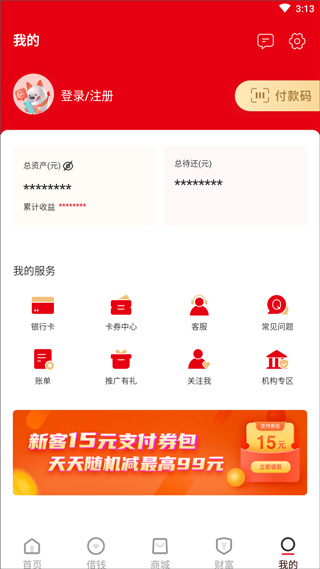 另外点击登录,登录账号后还可使用借钱、商城、财富等功能。