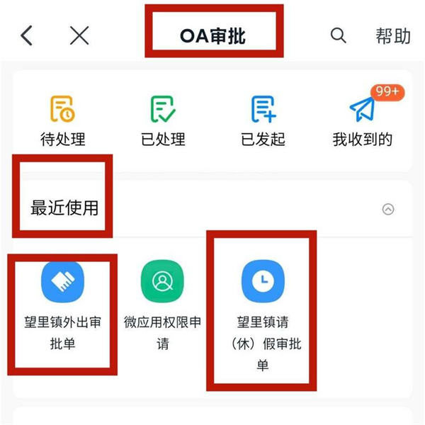 3、已操作过的,请选择最近使用的“望里镇外出审批单”或“望里镇请(休)假审批单”