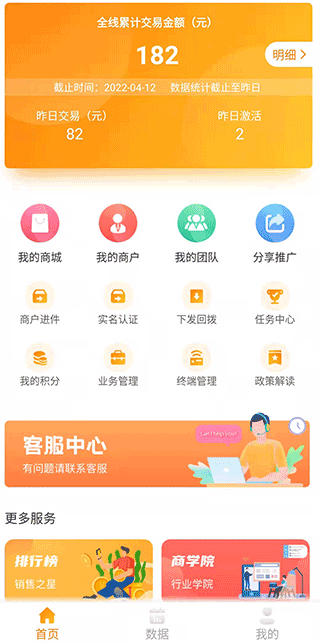 这是一款强大的营销业务助手,用户可通过该软件一站式使用支付功能,随时随地进行生意往来,有需求的话下载并了解即可。软件首页提供了交易情况的查看功能,还可以监控商铺的运营状况。商家可以在此管理业务和客户,调整终端设置,并查看最新政策解读。在“我的”页面,商家可以邀请未来合伙人,并查询自己的业务;在数据栏目下,商家能够全面掌握公司的盈利情况,并通过数据分析做出最佳决策。感兴趣的朋友赶快下载体验一下吧!