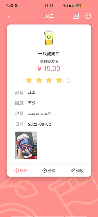 随时分享:支持随时分享到朋友圈,把自己得快乐分享给朋友。日常打卡:吨吨一杯奶茶下肚,什么味道?什么配料?是否踩雷?快来随手记录一下呀。