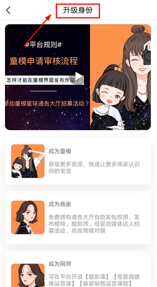 新学员拍摄出优质样片后,在童模星球APP [升级身份],申请成为童模,即可在[童模]版块晒作品,在[通告大厅]报名儿童用品、童装商家、母婴PR发布的各类模特招募活动。