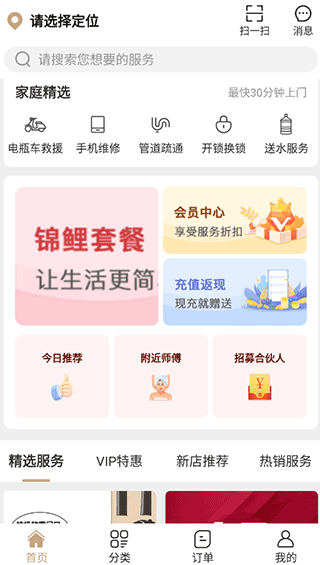 1、可以预定上门服务的时间以及日期,提前安排最好规划;可以直接点击快捷服务分类,进入其中查找服务员;