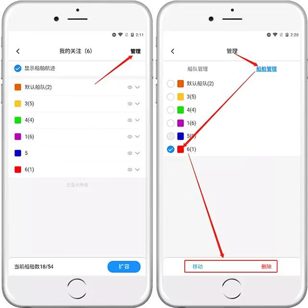 三、在船队里进行关注船舶的移动或删除点击右上角的管理,进入到管理页面,点击船舶管理,选中想要移动或者删除的组,点击移动或者删除就可以了;