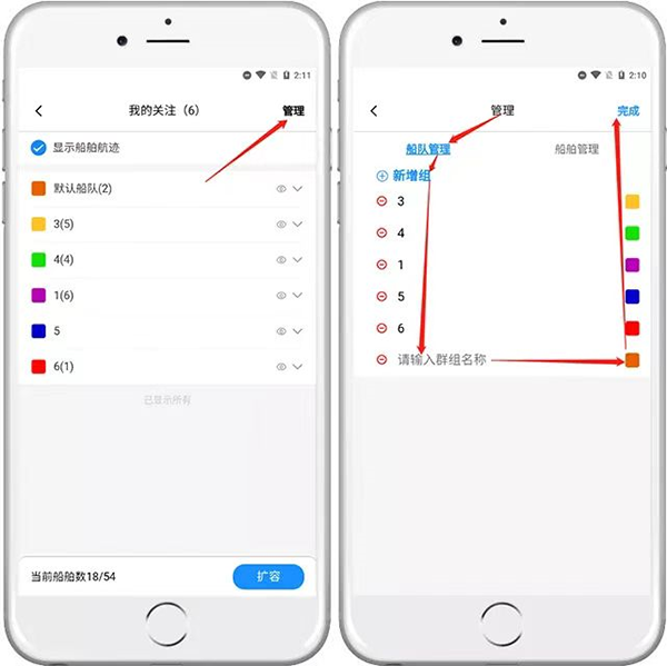 点击左下角的【关注】图标后,你可以点击管理,进入到管理页面,选择船队管理,点击新增组,接着输入组的名称和选择组的颜色,点击完成就创建好组了;