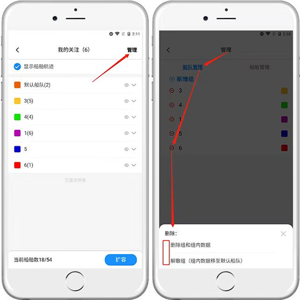 点击右上角的管理,点击船队管理,选中想要删除的组,在删除组时可以选择删除组和组内数据或者解散组(组内数据移至默认船队)。