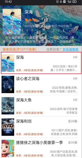 浏览相关影视资源列表,选择其中一个进入播放页面。