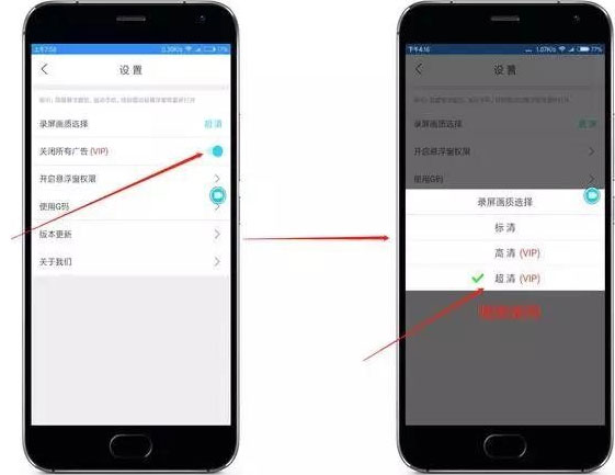 进入软件的【设置】界面,可以看到我已经开启了会员功能的【关闭所有广告】,还有这里我点击【录屏画质选择】;这里可以看到“高清模式”和“超清”模式都是需要vip才能开启,但是这些我们都可以随意使用。