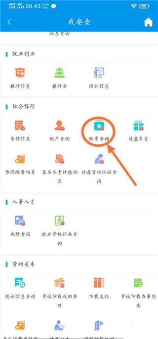 进入首页界面后,找到“我要查”或者“社会保险”中的其中一个项目,点击并进入。