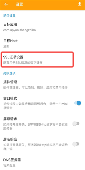 然后点击设置-目标应用-添加轻颜相机(为了不抓取其他多余的app的数据,方便找包)