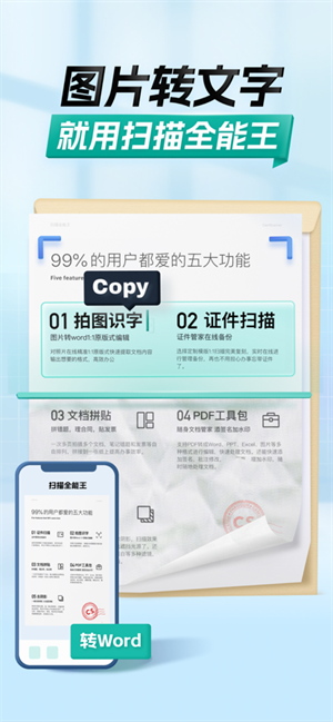 不过呢,小编今天给大伙带来的这个扫描全能王解锁全功能版本,能够帮您一键完成转换。它能够把图片里的所有内容扫描完生成您想要的文件格式,还能够智能地清理那些杂乱的背景。您也能添加滤镜,而且没有任何限制哟。有需求的小伙伴赶紧来下载!