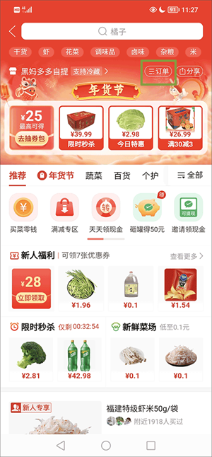 1、首先,打开软件,在多多买菜当中找到并点击绿色方框内的“订单”选项;