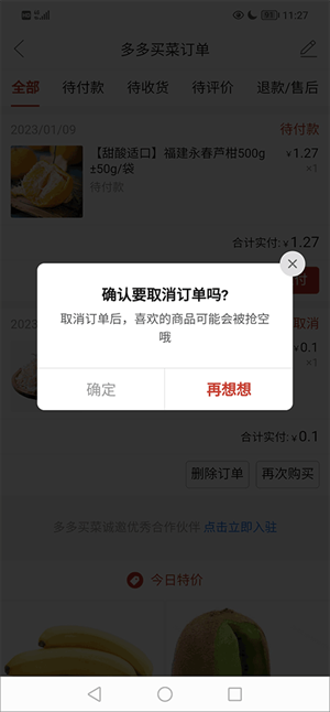 3、在弹出的选项框中找到并点击“确认”选项即可完成取消订单