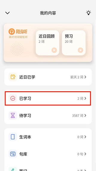 2、随后会进入到“我的内容”页面,在此处点击“已学习”选项。