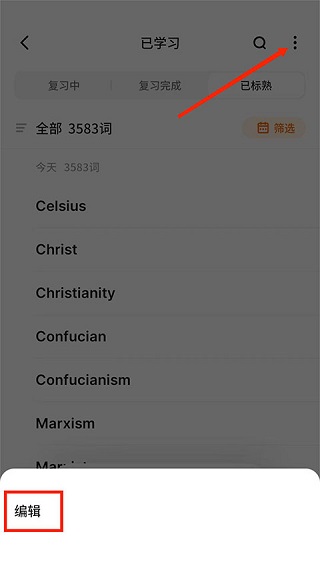 3、来到“已学习”窗口之后,找到右上角的三个点图标进行点击,这时会在下方弹出一个选项框,点击其中的“编辑”。