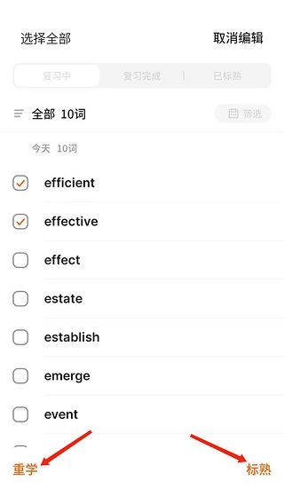 4、然后在打开的新界面中,将下方的单词全部勾选上,点击“重学”或者“标熟”。