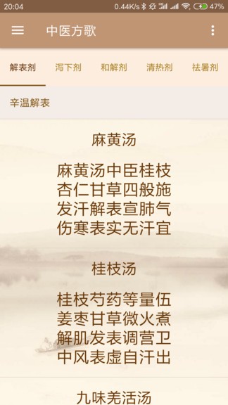 中医方歌更新版 涵盖了丰富的中医知识等着你探索,全面讲解了各种药材的功效及外观特征,并配以易记的歌诀,保证让你随时随地学习,使用起来极为便捷!