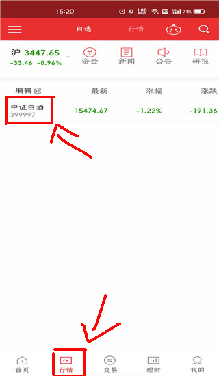 点击手机上的中原证券财升宝手机版软件,进入‘行情’页面,以中证白酒为例,点击进入详情页;