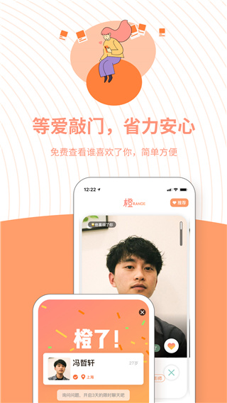 嗨,你还单身吗?如果你依旧相信真爱存在,也不抵触爱情到来,欢迎来到橙App。希望它能让城市里的年轻人多一些机会遇见对的人,多一点拥抱真爱的可能性。我们一起期待,生活会因此有些不同。橙社交软件每天为你推荐合拍对象,男生表达好感,女生接收信号;开启三日聊天,过滤低效对话,找到聊得来的TA;资料真实,态度真诚,交换微信或约定见面,让网恋可以奔现。橙App不仅仅是一个交友平台,更是一个帮助你找到真爱的工具,通过智能匹配和真实信息验证,确保每一次相遇都是值得期待的。
