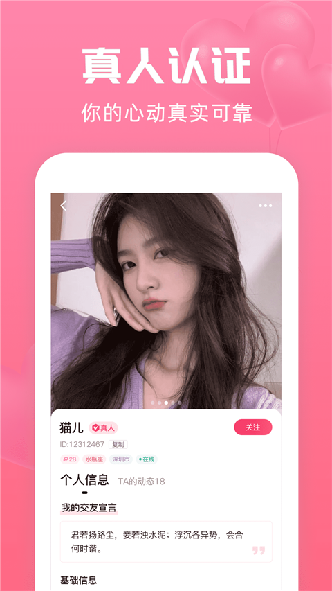 用户需要进行真人认证,拒绝各种虚假信息,专属标识帮你挑选心仪的聊天对象。