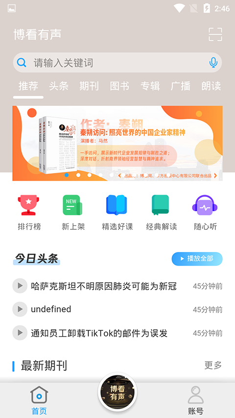 资源丰富:博看有声涵盖了文学、历史、政治、法律、哲学、经济、管理、军事、医学、艺术、教育等多个领域,分为国学经典、儿童文学、头条报道、历史文学、科技科普、商业财经、健康养生等二十余大类。无论你是想提升自我修养,还是寻找娱乐消遣,这里都能满足你的需求。
