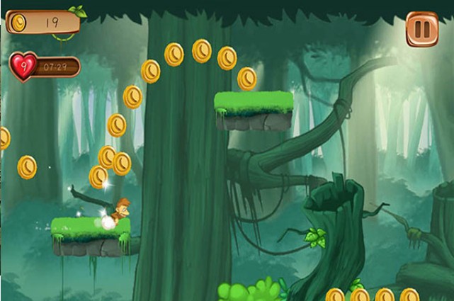 作品中打造出了独特且充满卡通风格的森林场景,你要操作画面中的小猴子在树木密集的地图中闯关,你在挑战中收集到的大量金币能用来购买道具,玩家在有了道具后就能赢取到胜利。