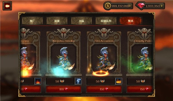 这些强化的项目都需要玩家消耗大量的金币进行升级,你要增强基础的属性和伤害,游戏中的技能尤为特殊,在战斗中技能的等级将会随着战斗次数而自然提升,而且英雄的使用方面你要尽量选择适合的英雄并对其进行强化和培养。