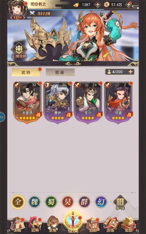 玩家可以通过幻世名将录主界面的征战按钮进行关卡挑战,每次挑战胜利后就可以获得经验、进阶丹以及武将碎片奖励了