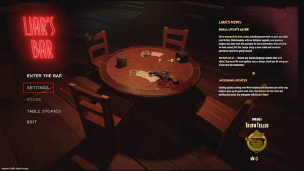 打开骗子酒吧游戏,进入游戏后,点击setting打开设置。