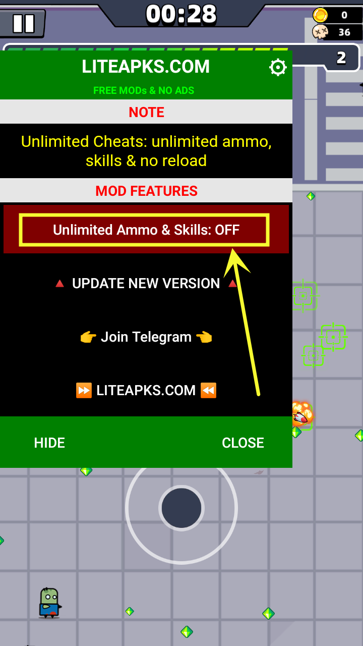 点击打开内置作弊菜单,在【Unlimited Ammo & Skills: OFF】这一行点击OFF切换为ON,无限弹药和技能模式就开启了。