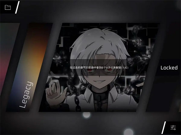 刚进入游戏会看到一大堆 Locked ,对应的章节如下图黄字标注。支线二的右边还有一个支线三章节。推荐一开始从左数第二的 Legacy 章节开始往后玩,按顺序解锁,最左的单曲精选集当作买歌商店。(Legacy章节现包含第一到第四章)
