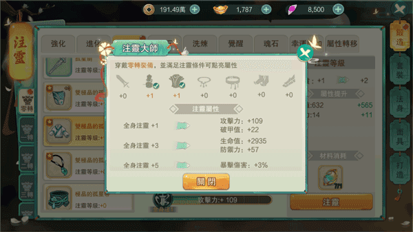 注灵石只能通过勾玉购买获得,点击注灵后可以为装备进行注灵,注灵不仅可以获得海量属性,当全身注灵等级达到一定条件时,还能启动注灵大师的属性。