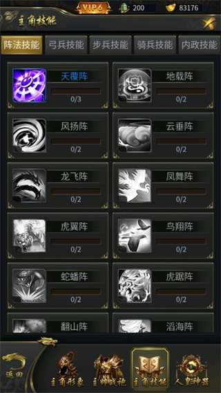主角技能分为五大类:阵法技能、弓兵技能、步兵技能、骑兵技能、内政技能。