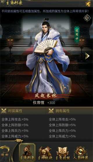 主公大人可以在主界面点击“主公”雕像进入主角界面,可以对主角的形象进行更换,主角形象可以通过晋级爵位、购买vip礼包、榜单奖励等多种方式获取,稀有的主角形象可以为主公提供各类属性加成