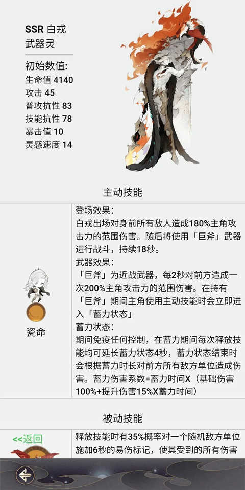 生命值:B 6594 ;攻击力 S 78 ;防御力: S 73 ;暴击值: A 34 ;灵感速度: B 25
