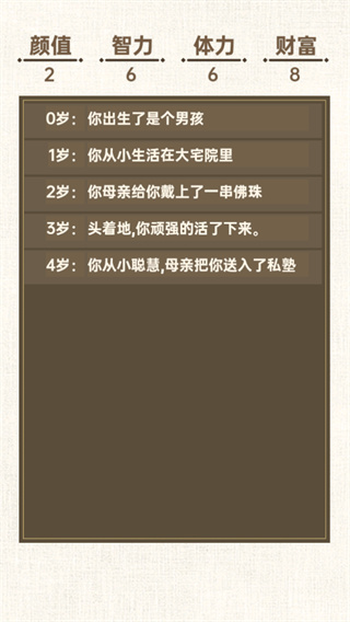 是一款以皇帝身份一直转世的休闲类游戏,玩家需要去挖掘各种不同的人生故事,因为每个人的人生不同,命运也不同,有些人从小就含着金汤勺长大,有些人却被饥饿而是,有些人甚至胎死腹中。想到这些小编只能说这世上有太多的不公平,但是我们又无力回天,只能说这该死又扯蛋的人生。不过你幸运好,因为在这款游戏当中无论你怎么转世都会一直都是皇帝,就是结局与过程不同而已。游戏玩法还是比较轻松简单的,其中就只有简单的文字,没有任何的图片、视频以及其他内容。对于新玩家来说极为容易上手,一开始小编玩的时候以为就那样,但是随着游戏的进行你会发现不仅沙雕还很魔性,如果你觉得人生不如意,那么直接点击重开,再精彩的活一次。