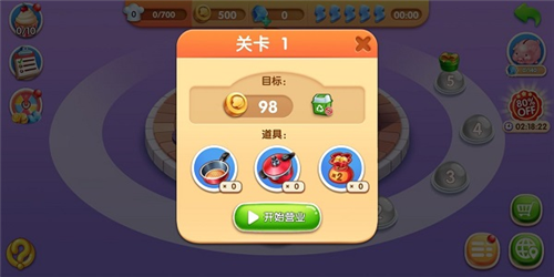 过关技巧游戏中,通关条件分为三个类型:1、营业一定数量金币;2、获得顾客好评数;3、上足够数量的菜。