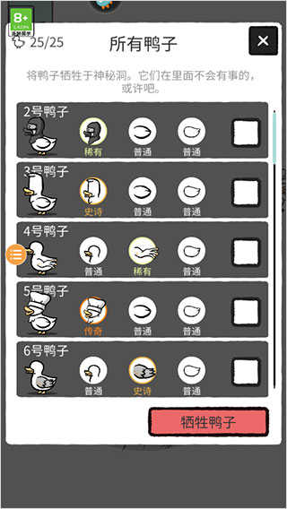 如果不喜欢某只鸭子,可以点击左边鸭子的图标,牺牲掉不喜欢的鸭子。