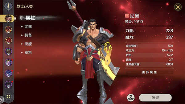英雄部分主要分为:属性、武器、装备、技能和资料五个部分。