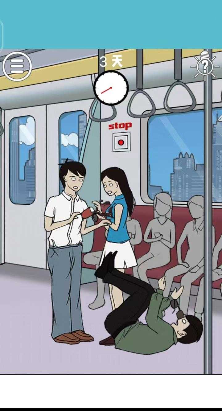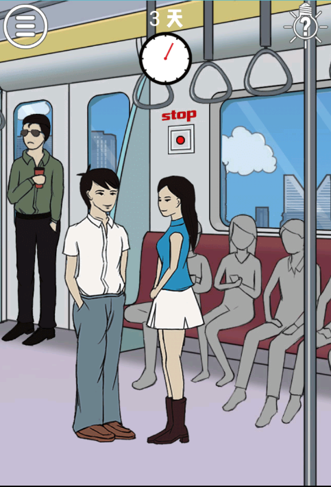 这一关先点击绿色衣服手上的饮料,再点击绿色衣服的男生,然后将绿色衣服男生拖动到女生的旁边,将饮料给白色衣服的男生,然后再点击画面中的【stop】红色按钮,即可通关;