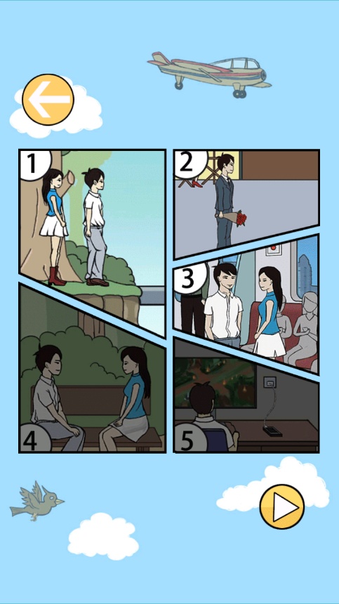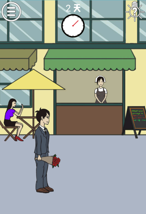 7、点击图片中穿紫色衣服的女孩和男孩手中的鲜花,将女孩拖到男孩身边,并把鲜花送给女孩,即可通过关卡。