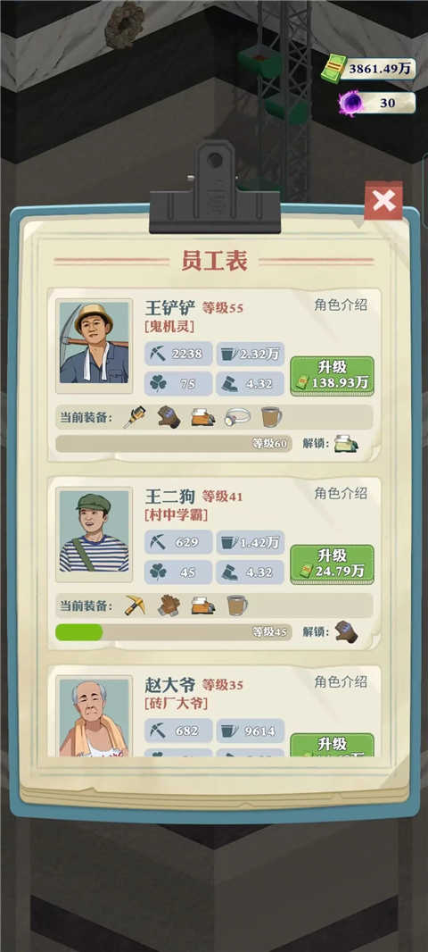 招募到员工后可以不断升级从而解锁新装备,提升各挖掘力~等级越高,所需要的金钱就越多,所以在金钱有限的前提下,比较推荐,先升级(消耗金钱比较少)的员工,能够更多的提升挖掘能力,性价比比较高的提升方式~