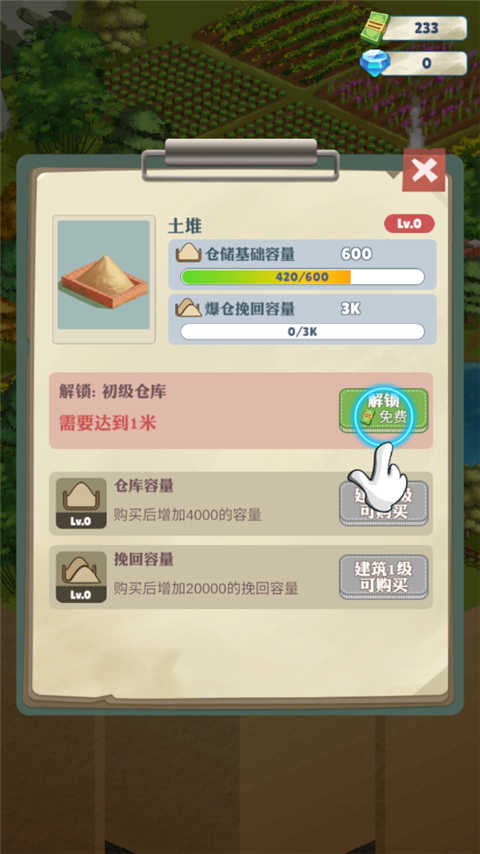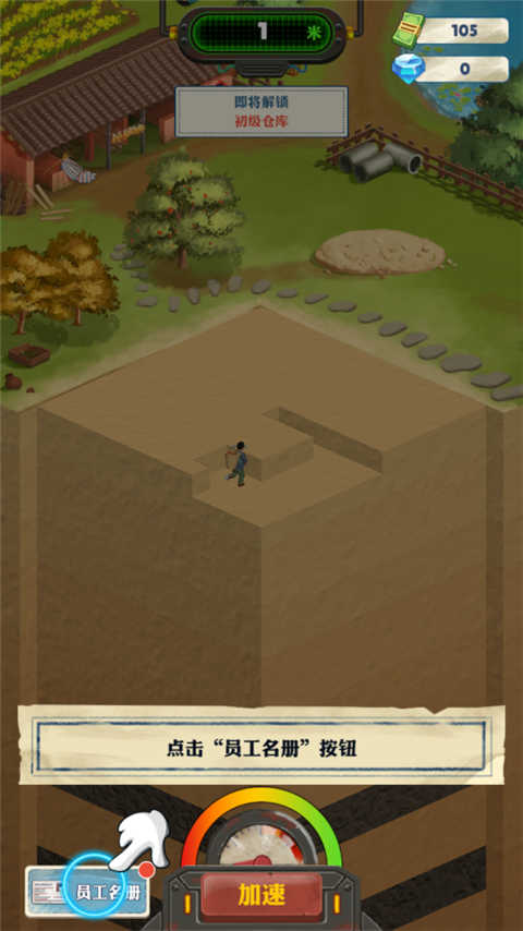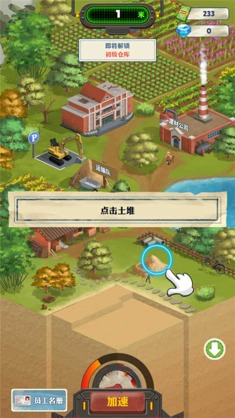 随着不断的挖掘,土堆也越来越多,地方不够了,需要一个仓库存方,我们点击土堆;