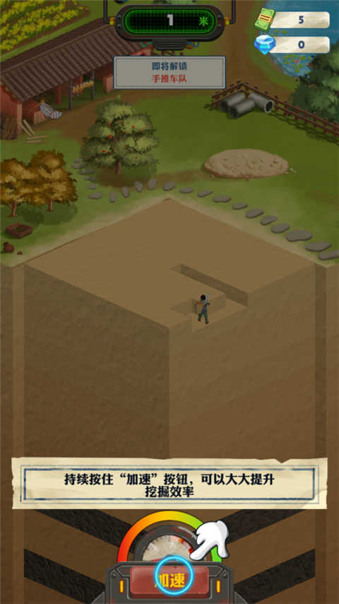点击升级,就可以升级角色的装备,加速挖掘速度;