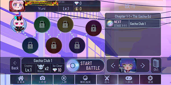 底部的“战斗”进入游戏关卡,从第一关开始,无限次消耗钻石,点击“START BATTLE”开始。