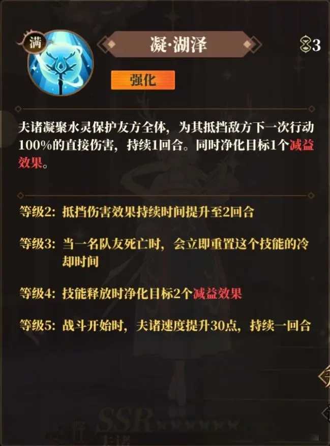 凝·湖泽:保护友方全体,抵挡下次行动100%的直接伤害;4个等级均提升较大。